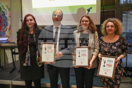 София (23 април 2024) В Световния ден на книгата и авторското право се връчва престижната награда „Рицар на книгата“. Организатор на събитието е Асоциация „Българска книга“ (АБК). Тази година наградите се присъждат за изключителни заслуги в областта на книгите и четенето за изминалата 2023 г. и включват четири категории, а номинираните са изявени учители, журналисти, писатели, преводачи, създатели на онлайн платформи, както и цели библиотеки и учебни заведения. На снимката (от ляво надясно): Петя Дикова, Виктория Готева, Мирослав Боршош.
