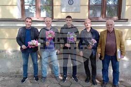 Велико Търново (24 април 2024) С поднасяне на цветя пред паметната плоча на футболен клуб „Етър" започнаха тържествата за 100-годишнината на великотърновския клуб, която се отбелязва днес - 24 април 2024 г. На снимката (от ляво надясно): директорът на Общинско предприятие "Спортни имоти и прояви" Петко Павлов, легендата на болярите и шеф на Зоналния съвет на Българския футболен съюз (БФС) Бончо Генчев, спортно-техническият директор на виолетовия тим Стефан Атанасов, дългогодишният спортен журналист и изследовател на историята на „Етър" Анатоли Петров и авторът на няколко книги за виолетовите и статистик на клуба Ангел Ганцаров.