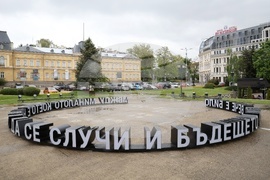 София (25 април 2024) Инсталацията на визуалния артист Красимир Терзиев "Между миналото, което е на път да се случи и бъдещето, което вече е било" е изложена в Градската градина в столицата. Арт инсталацията е разположена на мястото на бившия мавзолей в центъра на столицата.