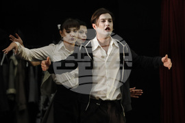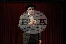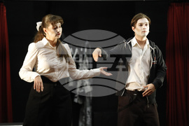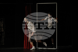 Русе (25 април 2024) Авторският музикален спектакъл „Емоции от първа необходимост“ по фрагменти от „Страх и мизерия в третия райх“ на Бертолт Брехт е новата премиера на ДТ „Сава Огнянов“ в Русе. Режисьор е Ева Данаилова - носител на наградата за млад режисьор „Слави Шкаров“ 2023 г. Премиерата на спектакъла е на 27 Април, в камерна зала на доходното здание в дунавския град. На снимката: Ивайло Драганов (мъжът с шапката) и Кристиана Цанкова