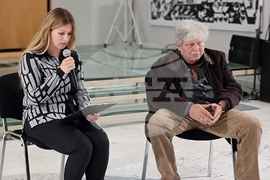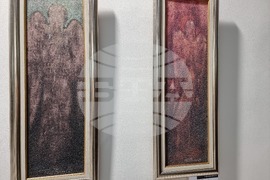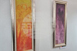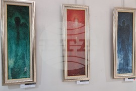 Ямбол (30 април 2024) Художникът Тихомир Витков (вдясно) подреди изложбата си „Ангели – невидимите спътници“ в културно-информационния център „Безистен“ в Ямбол. Експозицията е посветена на светлите Великденски празници и представя 24 живописни образа на ангели, допълнени от седем пластики.