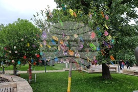 Ямбол (2 май 2024) За поредна година деца боядисват великденски яйца в центъра на Ямбол на Велики четвъртък. Дръвчетата в градинката пред централната поща са украсени от децата и учителите в детските градини. Монтирана е и празничната украса за Великден в центъра на града.