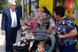 Кърджали (8 май 2024)В Кърджали официално бяха открити два нови пункта на детската млечна кухня в града, с което пунктовете стават общо три. Те са в най-големия квартал на родопския град - „Възрожденци“, от където са почти половината от ползвателите на предоставяната от община Кърджали социална услуга. На снимката: кметът на Кърджали Ерол Мюмюн (ляво) поздравява майките, дошли на откриването