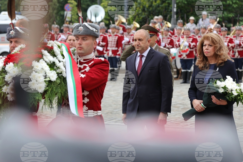София (9 май 2024) Президентът Румен Радев и вицепрезидентът Илияна Йотова поднасят цветя пред Паметника на Незнайния воин, по повод отбелязването на 79 години от победата над нацизма във Втората световна война.