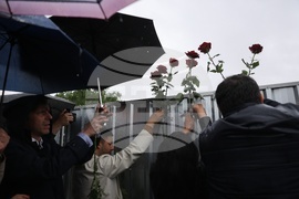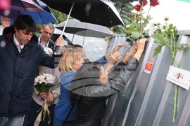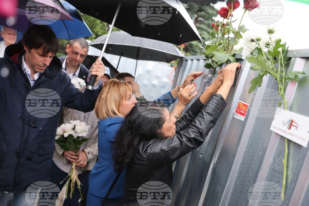 София (9 май 2024) Пред останките на Паметника на Съветската армия, кандидатът за член на Европейския парламент Ваня Григорова (вдясно), председателят на гражданската платформа „Изправи се.БГ“ Мая Манолова и техни симпатизанти поднасят цветя по повод Деня на победата – 9 май.