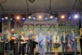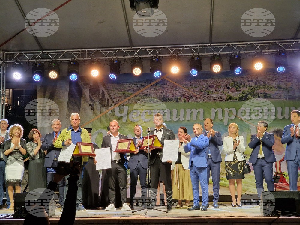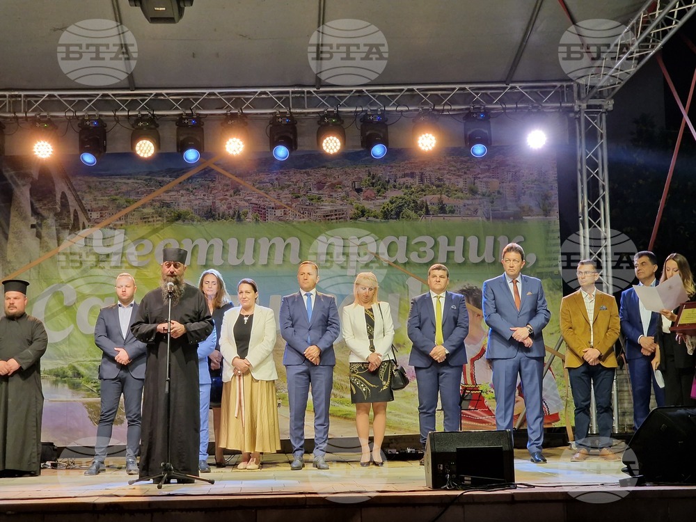 Сандански (9 май 2024) Сандански отбелязва своя празник. По традиция градът празнува на Светли четвъртък, през първата седмица след Великден, с Решение 38 на Общинския съвет от 9 март 1993 г., сочи справка на отдел "Справочна" на БТА. В днешния ден програмата започна с водосвет, програма на Народно читалище „Отец Паисий-1919“, както и традиционните народни борби. Кулминацията на празненствата бе тази вечер с концерт на площад „България“, в който участие взеха децата на Сандански, Торино и Пашата, Ансамбълът за народни песни и танци „Никола Вапцаров“, Духов оркестър – Сандански и др. На снимката: почетните граждани на Сандански Петър Мицин, Венцислав Айдарски и Николай Андреев.