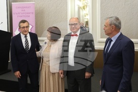 София (10 май 2024) За двадесет и седма поредна година Синдикатът на българските учители (СБУ) към КНСБ организира Националния конкурс "Учител на годината". В заключителния етап на тазгодишния конкурс, който се провежда в "София хотел Балкан", са номинирани 70 учители и директори в десет направления. На снимката (от ляво надясно): бившият служебен министър на образованието и науката Сашо Пенов, председателят на СБУ Янка Такева, бившите министри на образованието и науката Тодор Танев и Сергей Игнатов.