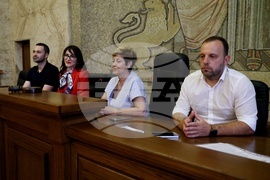 София (25 юни 2024) Ученици от всички столични училища участват в симулативен наказателен процес в зала “Тържествена” на Съдебната палата. На снимката (от ляво надясно): заместник-прокурорът Христо Кръстев, говорителят на градската прокуратура Десислава Петрова, градският прокурор Илияна Кирилова, заместник-градският прокурор Иво Илиев.