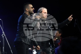 София (30 октомври 2024) Концерт на „Фондацията” в памет на Кирил Маричков се провежда днес в зала 1 на Националния дворец на културата (НДК). На снимката: Славчо Николов (вляво) - вокал, китара (Б.Т.Р.), Венко Поромански – ударни (Те).