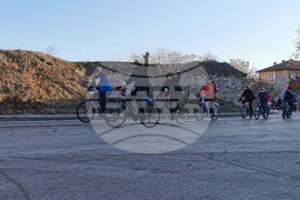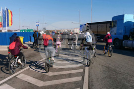 Калафат (4 януари 2025) Около 100 участници отбелязват с велопоход по „Дунав мост 2“, приемането в Шенгенското пространство и по суша на двете държави България и Румъния. Българските граждани, сред които и деца, изминаха общо 17 км. на велосипеди по предварително определен маршрут от центъра на град Видин до крайната точка - центъра на Калафат. На снимката: участниците във велопохода от българска и румънска страна, вече преминали границата от България в Румъния.