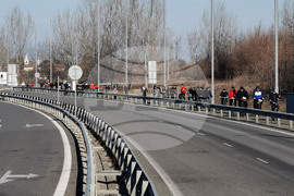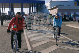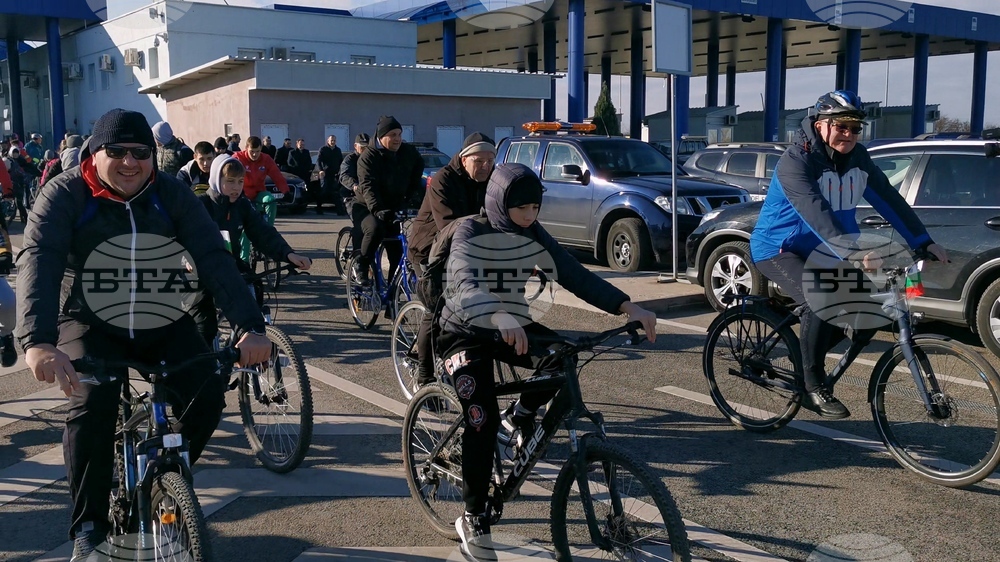 Видин (4 януари 2025) Около 100 участници отбелязват с велопоход по „Дунав мост 2“, приемането в Шенгенското пространство и по суша на двете държави България и Румъния. Българските граждани, сред които и деца, изминаха общо 17 км. на велосипеди по предварително определен маршрут от центъра на град Видин до крайната точка - центъра на Калафат. На снимката: участниците пристигат на границата с Румъния, водени от кмета на Видин д-р Цветан Ценков (вляво).