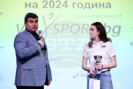 София (5 януари 2025) В театралната зала на частното училище „Свети Георги“ се провежда церемония по награждаването на “Най-добрия млад спортист на България до 19 г.” за 2024 г., организирана от сайта за детско-юношески спорт Viasport.bg и Фрий Медиа Груп ЕООД. На снимката: Награда получава Тимшел Костадинова, връчва от телевизионния водещ Ники Кънчев.