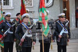 Бургас (6 януари 2025) Негово Високопреосвещенство Сливенският митрополит Арсений участва в празничния ритуал по повод празника Богоявление. Пред храм „Св. Св. Кирил и Методий” той и представители на бургаското духовенство благославят бойните знамена от Военен гарнизон - Бургас и отслужват водосвет и молебен за здраве на българската армия. Ритуалът преминава в литийно шествие по главните пешеходни улици на града. На снимката: кметът на Община Бургас Димитър Николов (вляво) и Негово Високопреосвещенство Сливенският митрополит Арсений (вдясно).