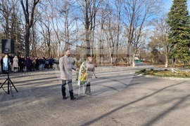 Разград (6 януари 2025) С полагане на венци и цветя пред паметника на Христо Ботев в Градския парк в Разград се отбелязват 177 години от рождението на българския поет и революционер. На снимката: председателят на Общинския съвет в Разград Галина Георгиева и кметът на Община Разград Добрин Добрев.