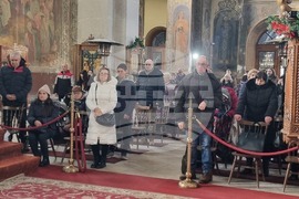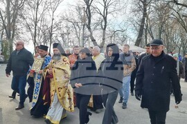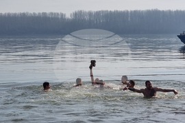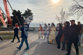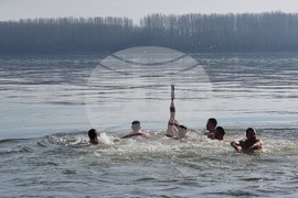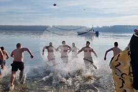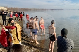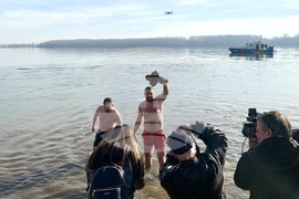 Видин (6 януари 2025) Учителят по информатика в Природо-математическата гимназия „Екзарх Антим I” Красимир Топчийски на 38 години от Видин, извади кръста на Богоявление от водите на река Дунав. В ритуала тази година се включиха девет участници, които задължително трябва да са православни християни и при записването да представят кръщелно свидетелство. След Светата литургия от катедралния храм "Св. вмчк Димитър Солунски" тръгна литийно шествие до брега на река Дунав, зад паметника на съпротивата, където архимандрит Самуил отслужи водосвет и хвърли кръста в дунавските води. На снимката (от ляво надясно): заместник-кметът на община Видин Десислава Тодорова, кметът на община Видин д-р Цветан Ценков, заместник-кметът на община Видин Борислава Борисова, секретарят на община Видин Емилиян Енчев.