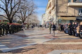 Шумен (6 януари 2025) На тържествена церемония до сградата на Драматично-кукления театър „Васил Друмев“ в Шумен празничен водосвет отслужи отец Красимир Капитанов (вдясно) и по традиция благослови и поръси със светена вода знамената на военните подразделения от Шуменския военен гарнизон, на местния клон на Националното дружество „Традиция“, на полкове и чети.