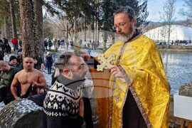 Перник (6 януари 2025) Ритуал по вадене на богоявленския кръст в Перник. Церемонията се състоя в езерото на Централния градски парк в Перник. На снимката: Онник Таракчиян получава благословия от отец Людмил.