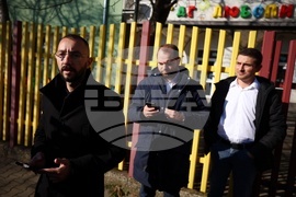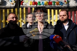 София (8 януари 2025) Представители на ГЕРБ-СДС в Столичния общински съвет дават изявление за медиите пред сградата на 134-та Детска градина "Любопитко". На снимката: общинските съветници от Местна коалиция "ГЕРБ-СДС" Анна Стойкова, Антон Хекимян (втори отдясно), Драгомир Младенов (вдясно).