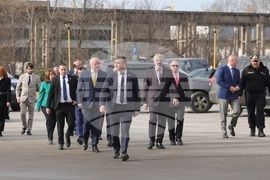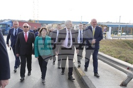 Русе (10 януари 2025) Пълноправното ни приемане в Шенген е достижение на много правителства и на много екипи, и няма да допуснем в това да се сложи лъжица катран, каза служебният премиер Димитър Главчев (вляво), който посети днес граничния контролно-пропускателния пункт (ГКПП) „Дунав мост” при Русе. Главчев е придружаван от служебните министри на регионалното развитие и благоустройството Виолета Коритарова (втора отляво) и на транспорта и съобщенията Красимира Стоянова. На снимката: посланикът на Република България в Румъния Радко Влайков (вдясно).