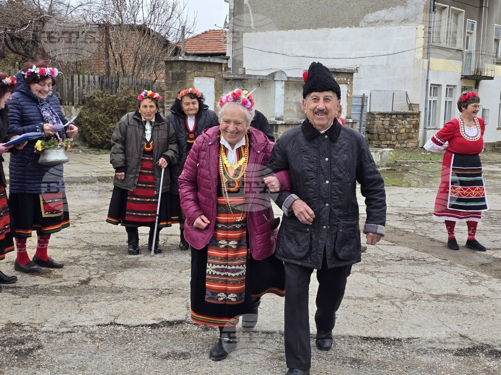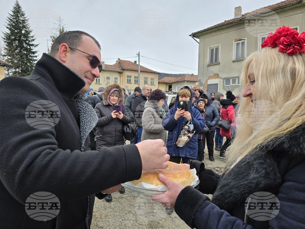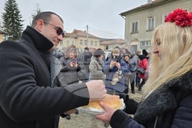 Село Радювене (12 януари 2025) Самодейци от Народно читалище "Полк. Стоян Едрев - 1895 г." в село Радювене, община Ловеч, пресъздават обичая "Дойлада", с който се нарича за женитба. На снимката: посрещане на зам.-кмета на община Ловеч д-р Алдин Начков (вляво) с топла погача и мед.