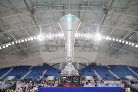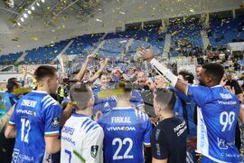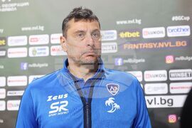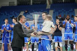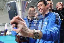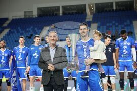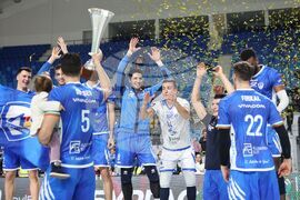 Бургас (12 януари 2025) Мъжкият волейболен отбор "Левски София" спечели Купата на България по волейбол. Победата дойде след мач с отбора на "Монтана Волей" в Спортна зала "Арена Бургас". На снимката: кметът на Община Бургас Димитър Николов (вляво) връчва трофея на Светослав Гоцев (вдясно).