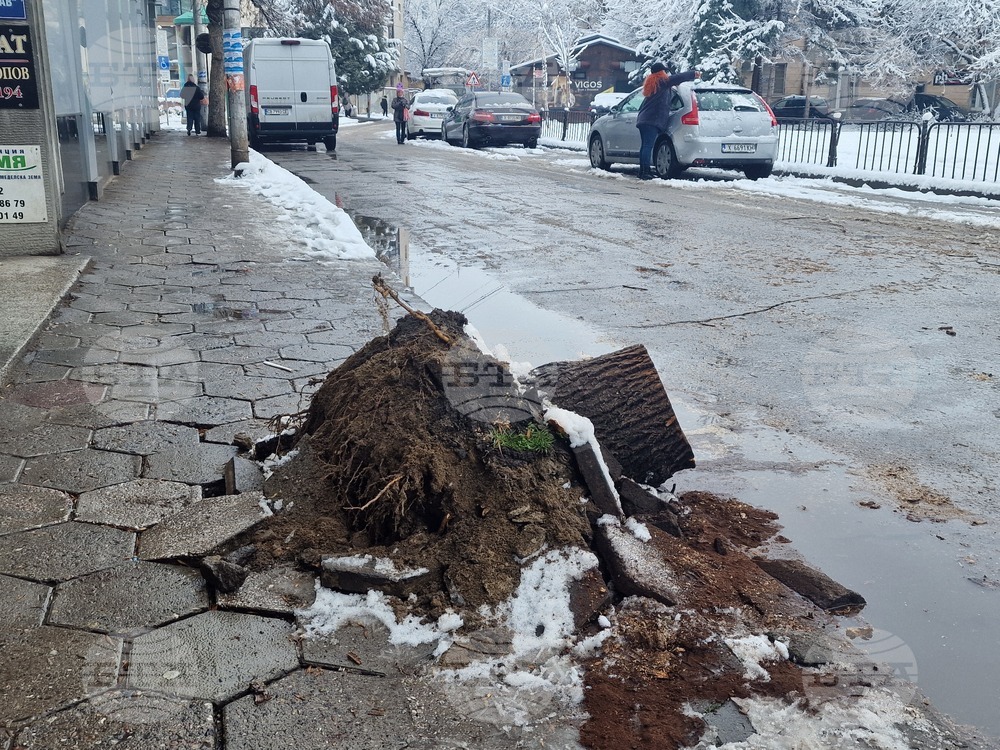 Хасково (13 януари 2025) Тази сутрин под тежестта на мокрия сняг падна изгнила дърво на улица „Преслав“ в Хасково. Мястото с намира в централната градска част. Няма пострадали и щети. Големи клони от дървета са паднали на две места на ул. „Иван Вазов“ през нощта. Единият е в близост до необитаема постройка. Другият клон на същата улица е паднал под напора на снега до паркинг. Леко са засегнати няколко коли на отсрещната страна на улицата. На снимката: падналото дърво на ул. „Преслав“.
