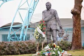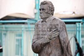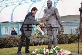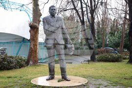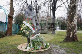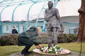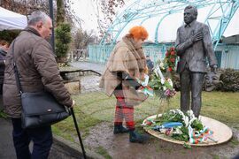 Бургас (13 януари 2025) Днес се навършват 100 години от рождението на българския актьор Георги Калоянчев (роден на 13 януари 1925г. - починал на 18 декември 2012г.). Годишнината се отбелязва с отдаване на почит и полагане на цветя пред паметника на актьора, разположен до Летния театър в Морската градина на Бургас. На снимката: цветя пред паметника полагат председателят на Съюза на артистите в България Христо Мутафчиев и актрисата Димитрина Тенева.