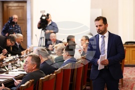 София (14 януари 2025) Кръгла маса по въпроса с водния режим в някои населени места, организирана от партия „Възраждане”, се провежда в сградата на Народното събрание. На снимката: народният представител Коста Стоянов.