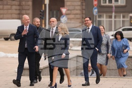 София (15 януари 2024) Представители на ГЕРБ-СДС пристигат в Президентството за получаване на мандат за съставяне на правителство. На снимката (от ляво надясно): Росен Желязков, Томислав Дончев, Рая Назарян, Теменужка Петкова и Даниел Митов.