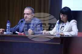 София (15 януари 2025) В Аула Максима на УНСС се провежда кръгла маса на тема "Достъпът до пазара за българските производители по агрохранителната верига" под егидата на ректора проф. д-р Димитър Димитров и по инициатива на акад. Атанас Атанасов и бившия министър на земеделието Кирил Вътев. На снимката: Александър Йоцев (вляво) експерт/консултант, проф. Зорница Стоянова, катедра "Икономика на природните ресурси" (вдясно).