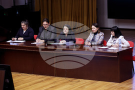 София (15 януари 2025) В Аула "Максима" на Университета за национално и световно стопанство (УНСС) се провежда кръгла маса на тема "Достъпът до пазара за българските производители по агрохранителната верига" под егидата на ректора проф. д-р Димитър Димитров и по инициатива на акад. Атанас Атанасов и бившия министър на земеделието Кирил Вътев. На снимката: (от ляво надясно): докторант Петър Атанасов, Елка Божилова, Дирекция "Политики по агрохранителната верига" МЗХ, доц. д-р Нина Типова, катедра "Икономика на природните ресурси", УНСС.