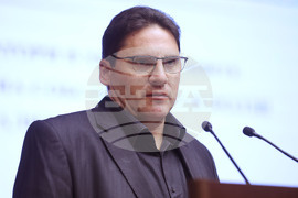 София (15 януари 2025) В Аула Максима на УНСС се провежда кръгла маса на тема "Достъпът до пазара за българските производители по агрохранителната верига" под егидата на ректора проф. д-р Димитър Димитров и по инициатива на акад. Атанас Атанасов и бившия министър на земеделието Кирил Вътев. На снимката: председателят на Държавната комисията по стокови борси и тържища Владимир Иванов.