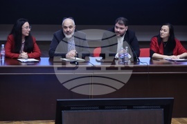 София (15 януари 2025) В Аула Максима на УНСС се провежда кръгла маса на тема "Достъпът до пазара за българските производители по агрохранителната верига" под егидата на ректора проф. д-р Димитър Димитров и по инициатива на акад. Атанас Атанасов и бившия министър на земеделието Кирил Вътев. На снимката (от ляво надясно): доц. Янка Казакова-Матева, катедра "Икономика на природните ресурси", докторантът по Икономика на природните ресурс УНСС, Мъгърдич Хулиян, Ерик Борисов, земеделски производител.