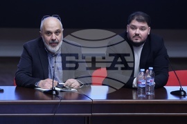 София (15 януари 2025) В Аула Максима на УНСС се провежда кръгла маса на тема "Достъпът до пазара за българските производители по агрохранителната верига" под егидата на ректора проф. д-р Димитър Димитров и по инициатива на акад. Атанас Атанасов и бившия министър на земеделието Кирил Вътев. На снимката: докторантът по Икономика на природните ресурс УНСС Мъгърдич Хулиян (вляво), Ерик Борисов (вдясно), земеделски производител.