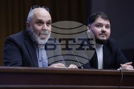 София (15 януари 2025) В Аула Максима на УНСС се провежда кръгла маса на тема "Достъпът до пазара за българските производители по агрохранителната верига" под егидата на ректора проф. д-р Димитър Димитров и по инициатива на акад. Атанас Атанасов и бившия министър на земеделието Кирил Вътев. На снимката: Стоян Чаушев (вляво) търговец пресни плодове и зеленчуци и Александър Йоцев (вдясно) експерт/консултант.