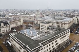 София (16 януари 2025) Народното събрание гласува като точка първа в дневния ред за днес номинирания за министър-председател Росен Желязков и предлаганите от него структура и състав на Министерски съвет. На снимката: изглед от високо на сградите на Парламента, правителството и президентската институция.