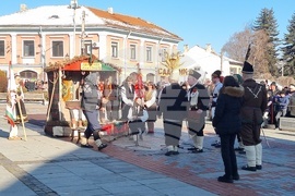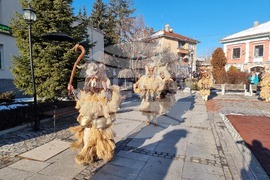 Брезник (18 януари 2025) Брезник е домакин на юбилейното двадесето издание на Общинския маскараден фестивал "Сурова". Шествие съчетаващо в себе си страховити маски, силен звън на хлопки и колоритни персонажи преминава по централните градски улици. Сурвакарите от Граово отправят своя традиционен благослов за здраве, добруване, плодородие и семейно щастие. Задължителен елемент е представянето на т.нар. граовска сватба. На снимката: кметът на Община Брезник Васил Узунов.