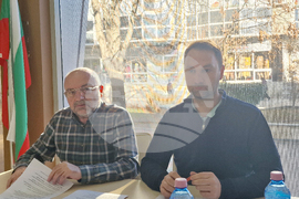 Разград (20 януари 2025) Общинските съветници от „Продължаваме промяната - Демократична България“” в Общинския съвет в Разград дават пресконференция в клуба-приемна на коалицията. Темата е свързана с бюджета на общината за 2025 г. На снимката (от ляво надясно): Митко Ханчев и народният представител Джипо Джипов.