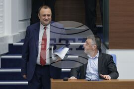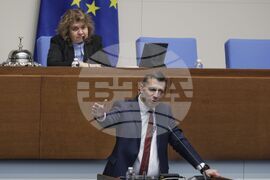 София (23 януари 2025) Парламентът провежда редовно заседание в сградата на Народното събрание. Депутатите изслушват министри относно принудителното изискване тежкотоварните автомобили да се вписват във виртуална опашка на гранично контролно-пропускателен пункт "Дунав мост“ при Русе, въпреки влизането на България в Шенгенското пространство и отпадането на граничния контрол за товарните превози. На снимката: министърът на финансите Теменужка Петкова (вляво), министърът на вътрешните работи Даниел Митов (вдясно).
