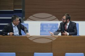София (23 януари 2025) Народните представители провеждат редовно заседание на Народното събрание. Депутатите изслушват министри относно принудителното изискване тежкотоварните автомобили да се вписват във виртуална опашка на Граничен контролно-пропускателен пункт „Дунав мост“ при Русе, въпреки влизането на България в Шенгенското пространство и отпадането на граничния контрол за товарните превози. На снимката: депутатът от ГЕРБ-СДС Лъчезар Иванов и министърът на вътрешните работи Даниел Митов (вдясно).
