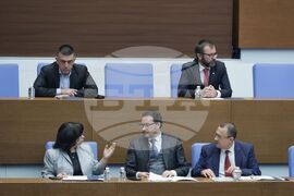 София (23 януари 2025) Народните представители провеждат редовно заседание на Народното събрание. Депутатите изслушват министри относно принудителното изискване тежкотоварните автомобили да се вписват във виртуална опашка на Граничен контролно-пропускателен пункт „Дунав мост“ при Русе, въпреки влизането на България в Шенгенското пространство и отпадането на граничния контрол за товарните превози. На първия ред (от ляво надясно): министърът на финансите Теменужка Петкова, министърът на вътрешните работи Даниел Митов и министърът на регионалното развитие и благоустройството Иван Иванов. Втори ред: директорът на Агенция „Митници“ Георги Димов и председателят на Управителния съвет на Агенция „Пътна инфраструктура“ Йордан Вълчев (вдясно).