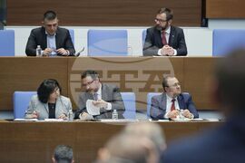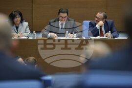 София (23 януари 2025) Парламентът провежда редовно заседание в сградата на Народното събрание. Депутатите изслушват министри относно принудителното изискване тежкотоварните автомобили да се вписват във виртуална опашка на гранично контролно-пропускателен пункт "Дунав мост“ при Русе, въпреки влизането на България в Шенгенското пространство и отпадането на граничния контрол за товарните превози. На снимката (от ляво надясно): първи ред министърът на финансите Теменужка Петкова, министърът на вътрешните работи Даниел Митов, министърът на регионалното развитие и благоустройството Иван Иванов, втори ред директорът на агенция "Митници" Георги Димов и председателят на УС на АПИ Йордан Вълчев.