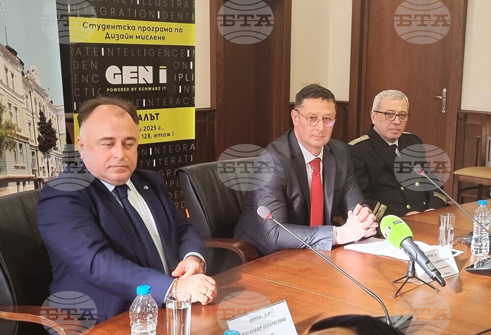 Варна (24 януари 2025) С проекти за „умна“ количка за пазаруване, сензорна витрина за плодове и зеленчуци, мобилна каса за самообслужване, сезонни супермаркети и приложение-игра, което насърчава клиентите да рециклират, се представят студентските екипи, състезавали се в първата по рода си в България иновативна образователна програма "GEN I: ИНОВАЦИЯ ГЕНЕРАЦИЯ". Зад нея стоят инициаторите от "Schwarz IT - България", с подкрепата на две от големите търговски вериги у нас, и в партньорство с три варненски университета - Икономическия, Техническия и Висшето военноморско училище. На снимката (от ляво надясно): Ректорите на трите университета, чиито студенти участват в програмата. Проф. Драгомир Пламенов, ректор на Техническия университет, проф. Евгени Станимиров, ректор на Икономическия университет и началникът на ВВМУ флотилен адмирал проф. д-р Калин Калинов .