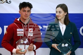 София (4 февруари 2025) Церемонията по награждаване на най-добрите спортисти на София за 2024-а и обявяване лицата на инициативата "Европейска столица на спорта" за 2025 година се провежда в Музея на спорта. На снимката: сноубордистът Кристиан Георгиев (вляво), олимпийската вицешампионка по художествена гимнастика Боряна Калейн (вдясно).