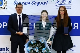 София (4 февруари 2025) Церемонията по награждаване на най-добрите спортисти на София за 2024-а и обявяване лицата на инициативата "Европейска столица на спорта" за 2025 година се провежда в Музея на спорта. На снимката: кметът на София Васил Терзиев (вляво), олимпийската вицешампионка по художествена гимнастика Боряна Калейн (в средата), член на УС на БФХГ Юлия Мумджиева (вдясно).