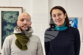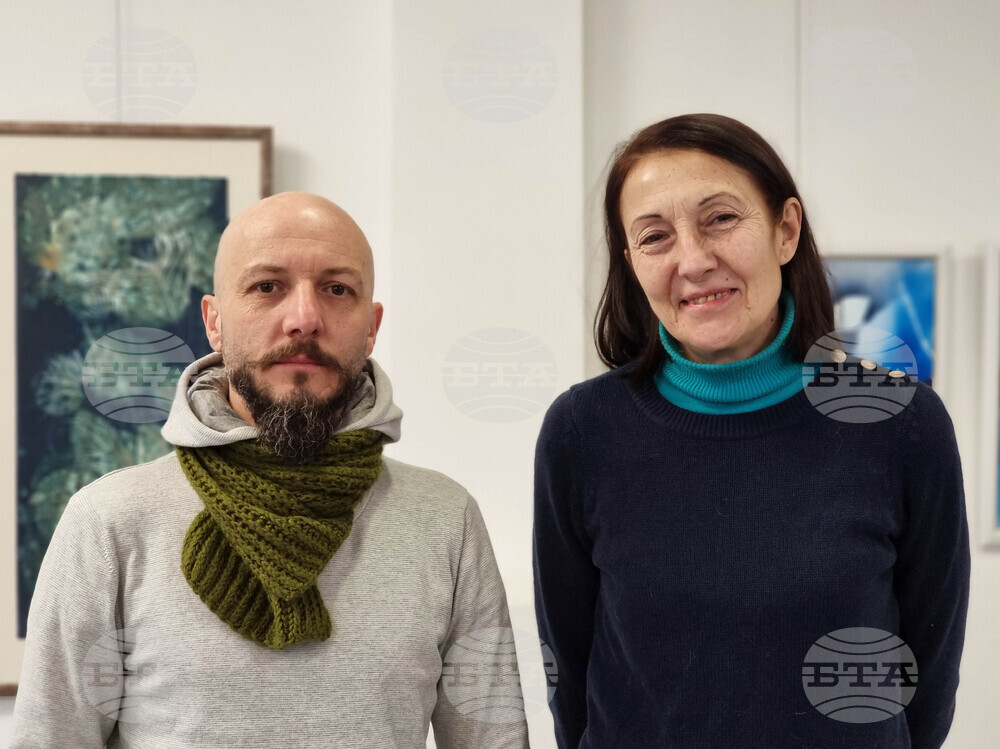 Ямбол (6 февруари 2025) Творби на художничката Радостина Колева (вдясно) и фотографа Стефан Каменов (вляво) се срещат в съвместната им изложба „Светлини и сенки в синьото“. Общо 67 свои произведения показват двамата творци в Арт галерия „Кирил Кръстев“ в Ямбол. Изложбата може да бъде разгледана от днес до 17 февруари.
