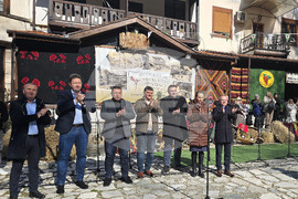 Мелник (8 февруари 2025) В най-малкия, но изпълнен с история и дух град на България - Мелник се провежда традиционния фестивал на мелнишкото вино „Златен грозд". На снимката (от ляво надясно): кметът на Мелник Саша Филипов, кметът на Петрич Димитър Бръчков, кметът на Струмяни Валентина Чиликов, народният представител Георги Георгиев, народният представител Костадин Стойков, ръководителят на Представителството на Европейската комисия в България Йорданка Чобанова и кметът на Сандански Атанас Стоянов.
