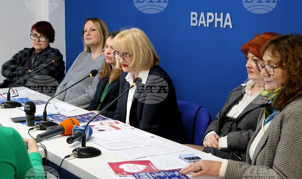 Варна (10 февруари 2025) Пресконференция на ръководството на Театрално-музикален продуцентски център, посветена на програмното съдържание, фестивалните събития и новите творчески проекти за 2025 година на Държавна опера Варна и Драматичен театър „Стоян Бъчваров” се провежда в Националния пресклуб на БТА във Варна. В нея участват (от ляво надясно): Елица Матеева, артистичният директор на Държавна опера Варна Бойка Василева, Пламена Александрова, директорът на ТМПЦ Варна Даниела Димова, артистичният директор на ДТ „Стоян Бъчваров“ Варна Веселина Михалкова, директорът на Дирекция „Култура и духовно развитие“ в Община Варна Светослава Георгиева.