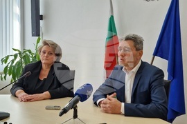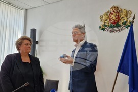Шумен (10 февруари 2025) Областният управител на Шумен Катя Иванова (вляво) встъпи в длъжност и прие печата на областната администрация от предшественика си на поста Бейнур Ахмед (вдясно). Тя каза, че е излязла от политиката през 2005 г. и не е политическа личност, като определи водоснабдяването като най-наболелия проблем за региона.