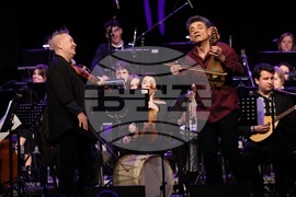 София (13 февруари 2025) Британският цигулар и виолист Найджъл Кенеди (вляво) изнася концерт в зала 1 на НДК. Цигуларят представя авторския си концерт за цигулка Номер 1 Fur Ludwig Van, което е най-новото му произведение. Участие взимат Георги Андреев (вдясно), гъдулка и Врачанската филхармония с диригент Христо Павлов.